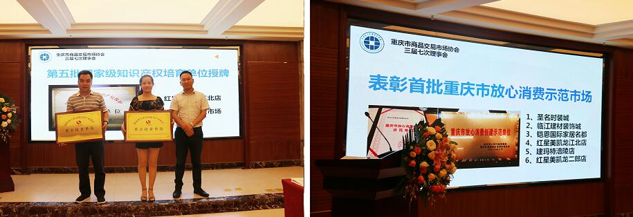 接下来市商务委建设处处长余晓玲、市工商局市场消保处副处长何克强、市知识产权局协调处副处长张朝君分别为“优秀巾帼操盘手”、“放心消费示范市场”、“知识产权规范化培育市场”颁奖并授牌。