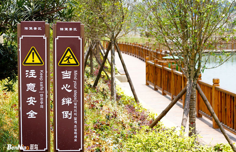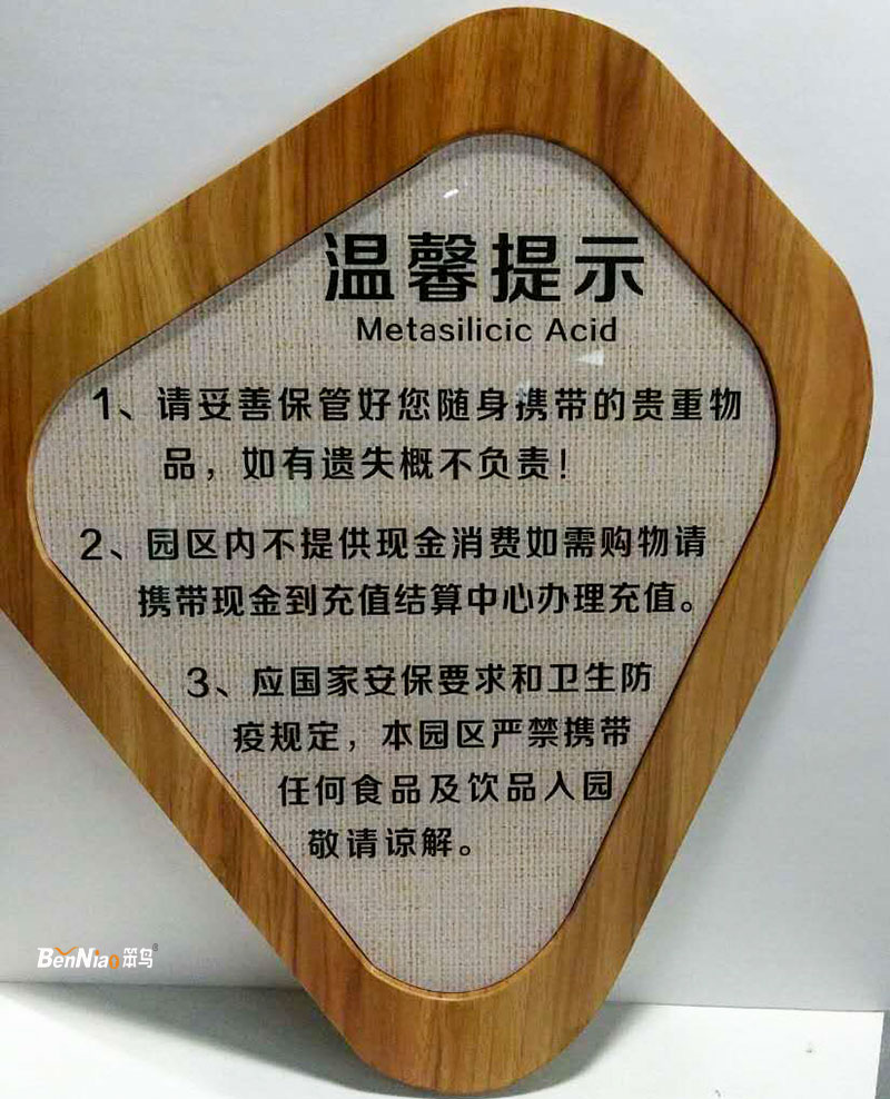 作为一个提示标识牌,在不同的环境中,有着不一样的造型,不一样的颜色,有时也会起到一个装点的作用,让原本的环境多了一点不一样、多了一点颜色,让人们在观赏的同时,也不会忘记留意下牌子上的字。从而约束自己的一些不恰当的行为。