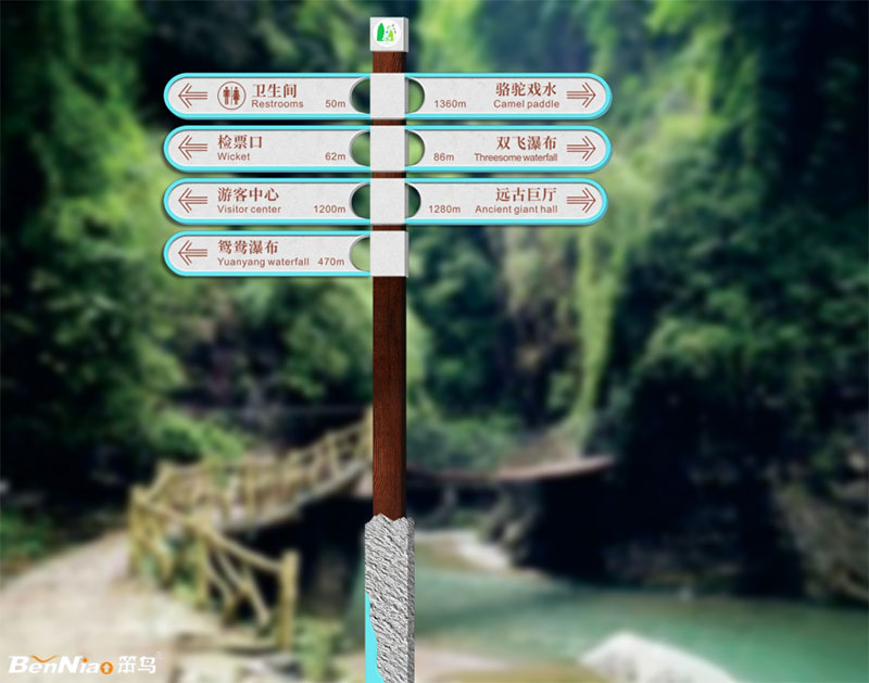 3、单柱式:该类旅游景区标识的构造简单,设定场地一般挑选狭小的旅途,它一般设定在2个或好几个空间彼此之间转换或交叉的本地。一般做为交通出行导向性标识牌来应用,柱头上能够一起设定总数较多的标识牌,传递很多的标示信息和相对应的标示方位,那样就能让游客在没有了解的空间中迅速,很快地得到信息。