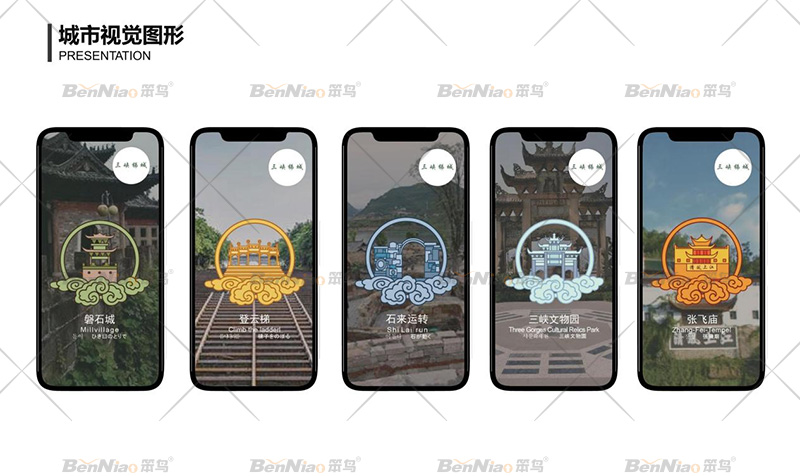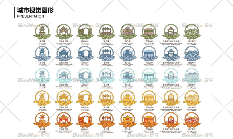 城市视觉图形是城市视觉形象的核心,是城市内涵意义的主要视觉载体,它可以直观地反映出城市的视觉识别特征,将抽象的城市内涵与精神以视觉的方式呈现出,浓缩成为城市的标志或象征物为公众所认知。笨鸟视觉设计师通过对云阳县独特的历史文化、自然文化和地标性建筑的提炼,使其图形化,扩大设计语言的丰富性,展现云阳地理信息文化,从而借此契机尽早的统一城市形象,打造云阳自身特色品牌。并将带有浓郁特色标志性图案应用到云阳县城市环境中去,服务于云阳县的城市发展,丰富其文化。