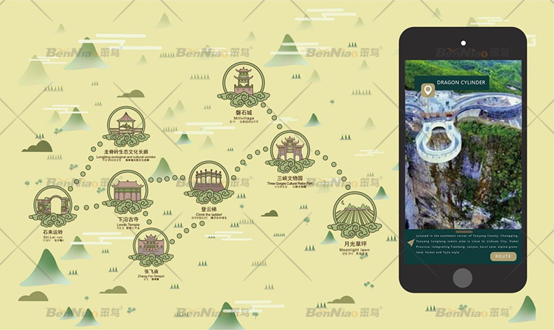 将手绘地图运用在导视系统中,景区完整呈现在游客面前,让游客对云阳县景区全貌一览便知,极大的方便了游客对于参观路线的选择,了解整座城市的旅游景点,人文历史,为推动云阳县旅游发展奠定基础。