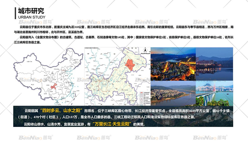 为促进城市建设发展、文旅品牌打造,实现云阳县全域旅游发展新格局,我们详细了解了云阳县城区的城市规划、优势产业、特色文化等情况。用超前的理念、独特的眼光,把云阳县的历史文化传统、城市建筑的外观风貌与城市的社会文化活动有机结合起,深入挖掘云阳县文化资源的历史价值、文化价值、景观价值和精神内涵,使优秀传统文化在继承中发扬光大,吸引更多的人来云阳县体验独特的地域文化,以此来传播云阳县城市品牌,进行城市品牌的塑造提升云阳旅游知名度和美誉度。