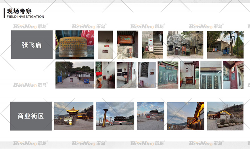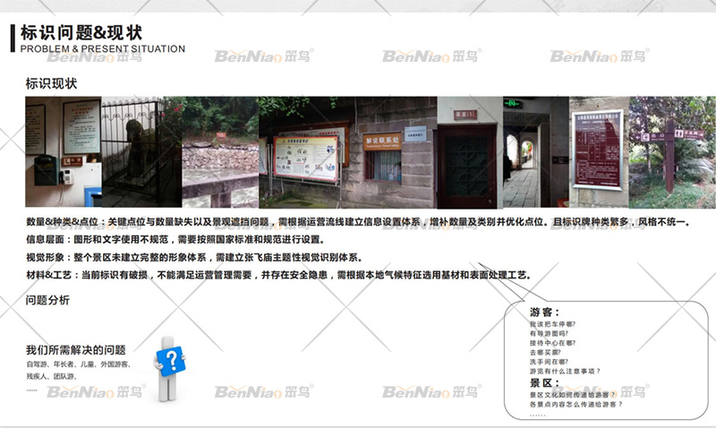 项目研究:为了更好的契合张飞庙景区导视需求,在项目开展的初期,对于研究范围内的用地和导视功能现状进行了详细的实地调研。过程中发现了诸多的问题,经过总结整理出以下几项内容:现状各级标识功能混乱,不成体系,无法满足各级标识对应的信息识别需求。现状标识形象混乱,缺乏统一风格,标识信息不规范等。