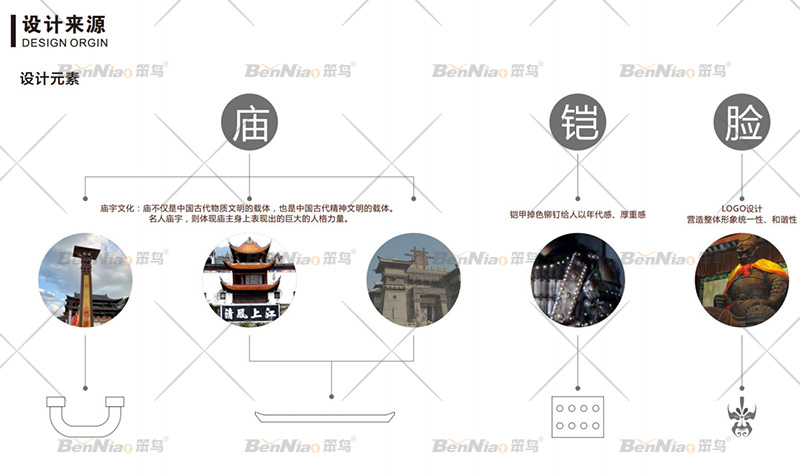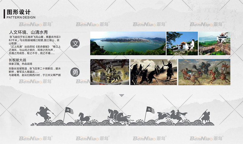 在张飞庙景区导视设计元素中,抓取蜀汉三国张飞历史、金戈铁马以及具有1700多年的庙宇文化作为整个设计的主要视觉元素进行提炼,对于景区和商业区空间以整体风格统一,局部区分展示。