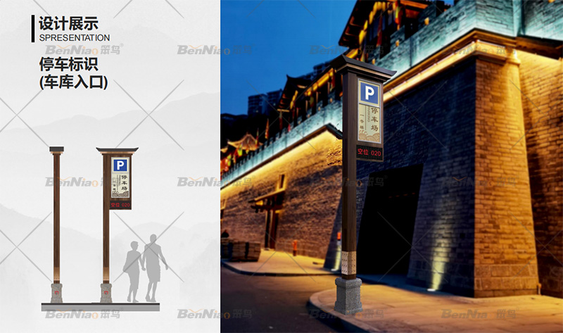 笨鸟从整体上梳理构建标识体系,合理规划点位布局,完善标识指示信息,统一标识设计风格。设计了停车指示标识、导向一级二级标识、温馨提示标识等。