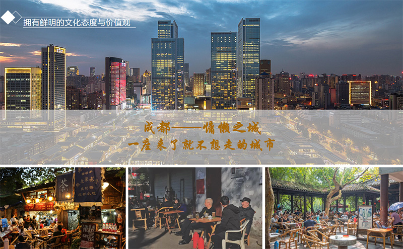 成都是我国率先有组织地为城市品牌形象进行定位的城市,他们总结概括成都人爱好休闲舒适生活的特质,提炼出“安逸”“懒”等词汇,将成都定位为一座“慵懒”之城, 并在2003年就以“成都,一座来了就不想走的城市”作为城市品牌形象宣言。