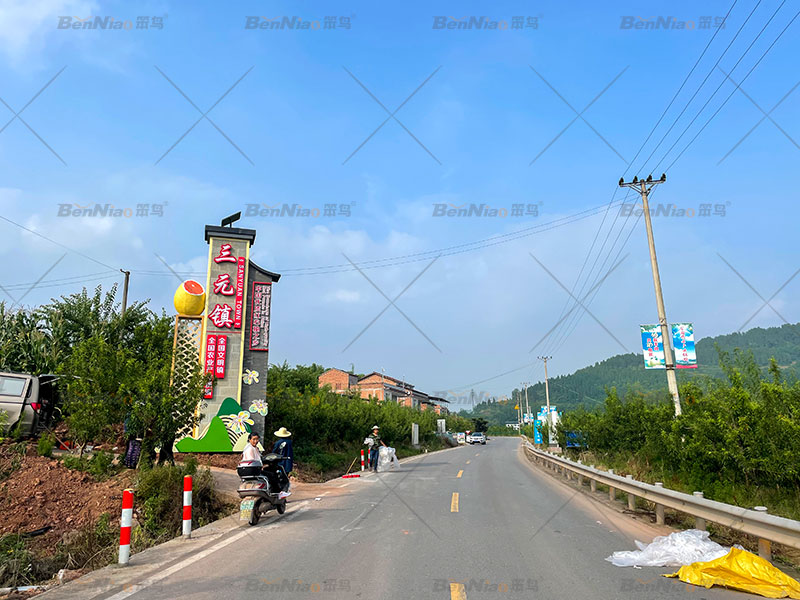 笨鸟文旅结合三元镇道路交通实际现状,沿着交通干道规划、设计、制作、安装了“产业精神堡垒、产业信息牌”等设施,大多采用简约风格,统一主色调和设计式样,整体效果与村情、村容、村貌、村景融为一体,相得益彰,为三元镇增添一道道美丽风景线。