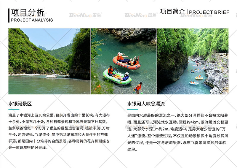 水银河大峡谷漂流 :国内水质最好的漂流之一,绝大部分漂程都不会被太阳暴晒,而且还可以河滩戏水互动。漂程约4km,激流缓滩交替更迭,大部分水深1m到2m,难度适中,是男女老少皆宜的“万人迷”漂流。整个漂流过程,不仅是船动景移换个角度欣赏风光的过程,还是一次与激流缓滩、瀑布飞雾亲密接触的体验过程。