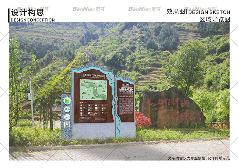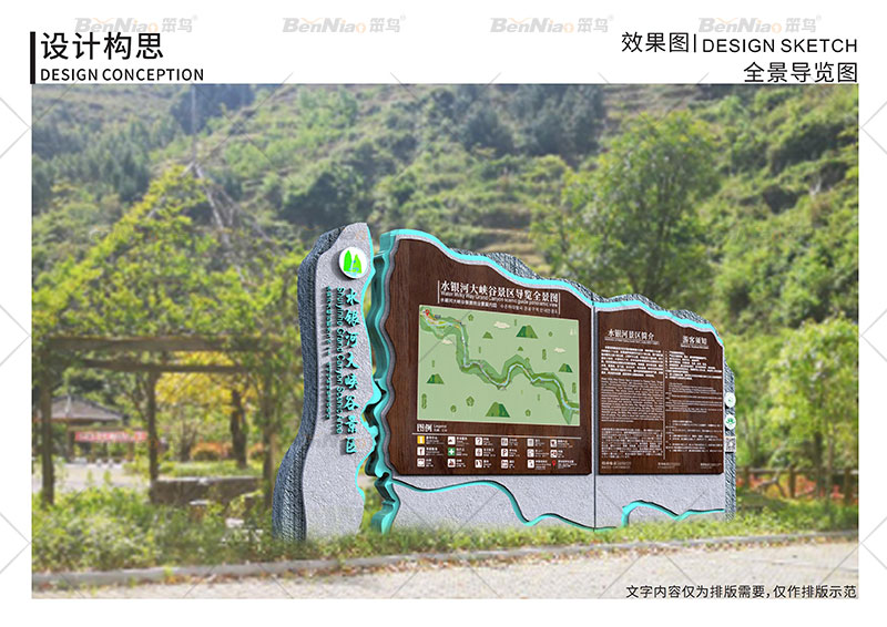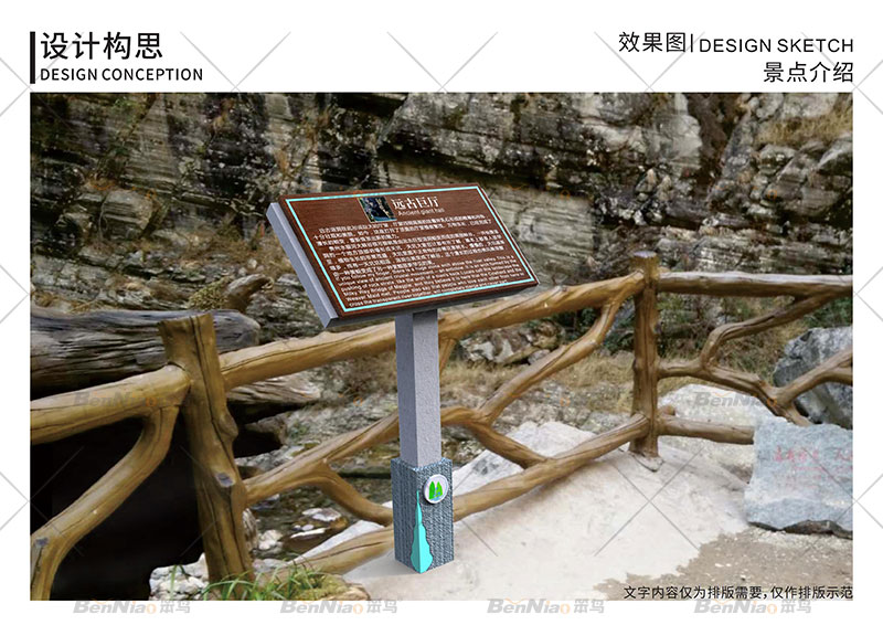 三、说明导视系统:在旅游景区中说明性导视系统必不可少。它表达了希望被游客了解的内容,让游客对当地的景区特色、历史、旅游景点等有一定的了解。让游客在旅行的过程中拥有更好的体验。同时也方便管理者进行管理。笨鸟文旅为水银河大峡谷景区规划设计的景区介绍标识牌。