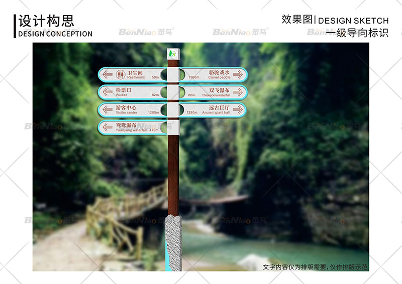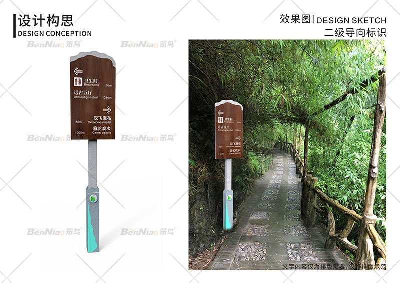 在当前的社会环境当中,国家对第三产业高度重视,同时第三产业已经成为了国民经济的一个重要部门,相关的管理部门和管理人员对旅游景区的标识系统给予高度的重视。景区标识系统作为风景区重要的旅游服务设施,要在协调好“经济一社会一生态”三大效益的基础上进行规划和管理,用绿色环保设计理念进行设计和制作。努力实现景区标识系统功能的合理化、实用的舒适化、空间艺术的人性化。一套完整的、人性化的、有特色的、审美的导视系统一方面能够为游客带来美好的旅游体验,另一方面也能从本质上提升景区的形象。