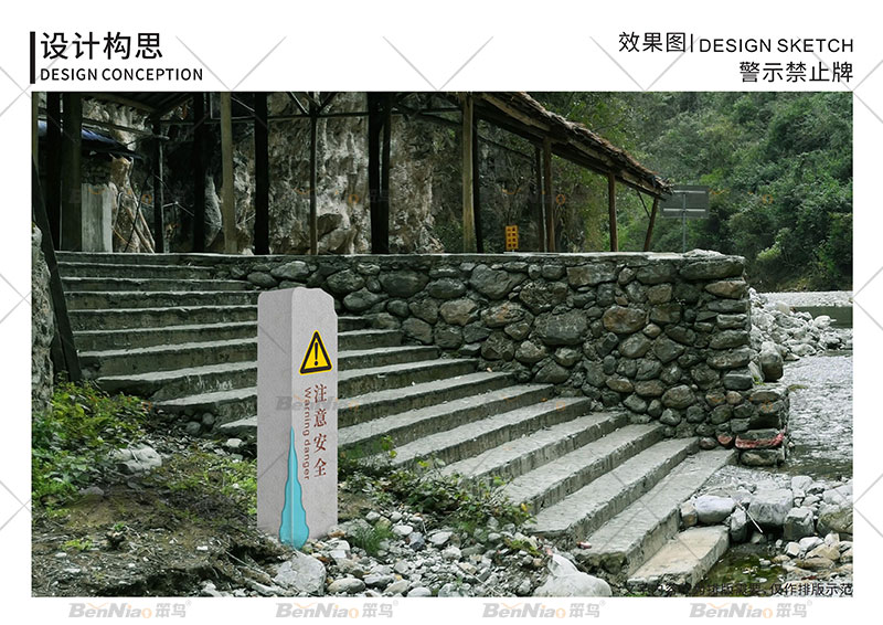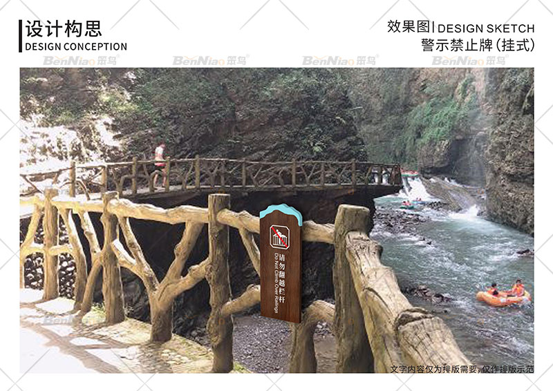 四、管理提示导视系统:管理提示导视系统是指为了提示道德规范、秩序规范或者相关法律内容为目的的设计。以确保风景名胜区的安全、和谐、秩序。放置一些警示牌,提醒游客不要踩踏花草,不要破坏公共设施,注意自身安全。。此方案中我们规划设计了注意安全、请勿翻越栏杆等标示牌。