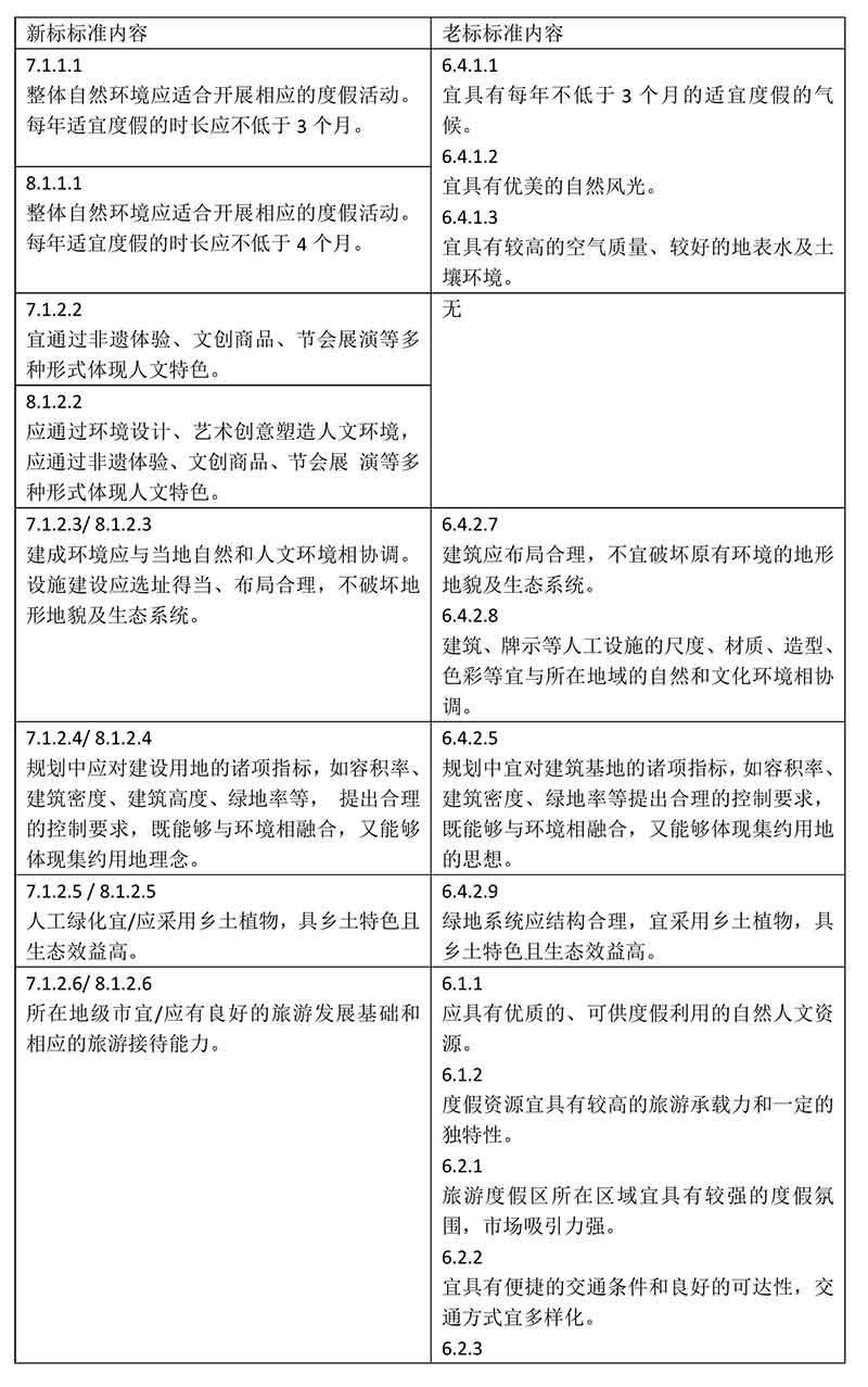 可以看到,新标的“度假环境”部分,主要是由老标中的“资源”“区位”“空间环境”整合归并而来。相比老标中“等级划分的一般条件”,新标也明确了“省级旅游度假区条件”和“国家级旅游度假区条件”的不同。
