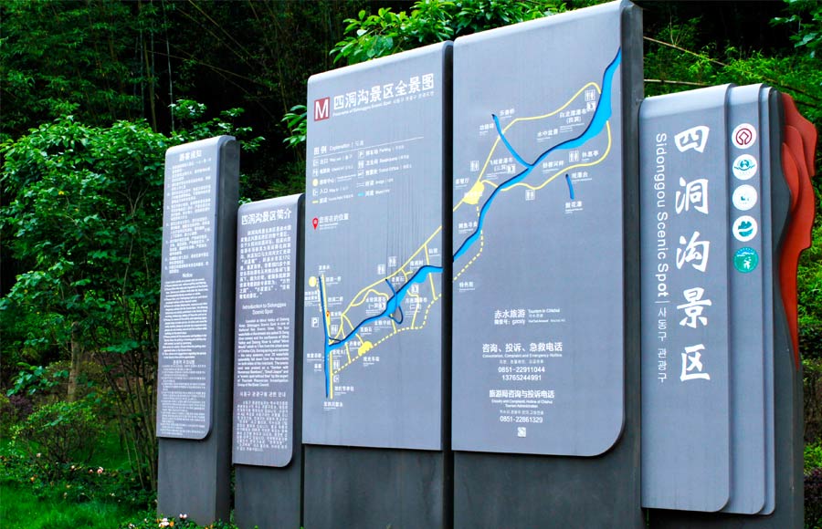 我们根据游客的视觉感官,根据游客的游览路线,分布分类的来引导、指引游客游览;来把我们景区标识分为城市旅游公共信息导向系统和旅游景区公共信息导向系统两部分,其中旅游景区标识我们归纳为五大类。 景区总导游全景图、景区景点介绍牌、景区道路导向指示牌、警示关怀牌、提示标识牌。